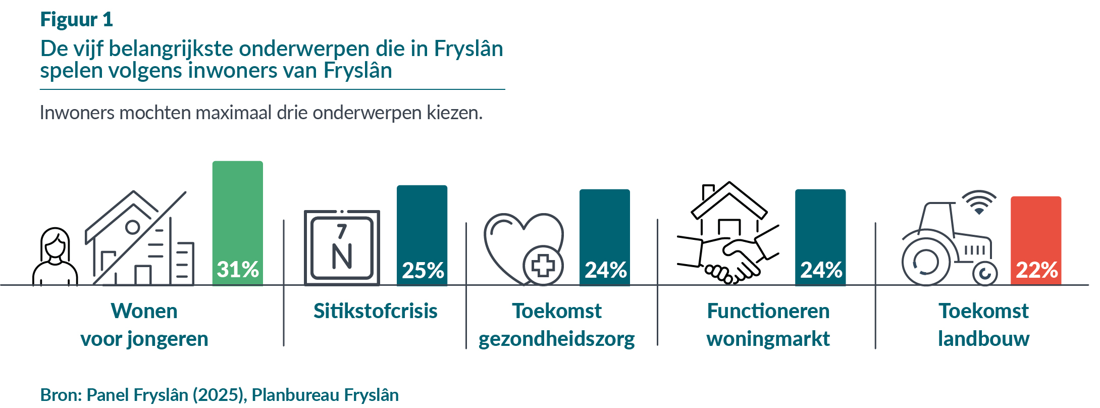 Naast redenen om te stemmen, is er begin dit jaar ook aan inwoners gevraagd naar wat zij zien als de belangrijkste onderwerpen voor Fryslân. ‘Wonen voor jongeren’ werd het vaakst genoemd, gevolgd door de stikstofcrisis, de toekomst van de gezondheidszorg, het functioneren van de woningmarkt en de toekomst van de landbouw. Deze top vijf komt grotendeels overeen tussen verschillende groepen, al zijn er enkele opvallende verschillen op basis van leeftijd en opleidingsniveau. Zo vinden jongeren bereikbaarheid en immigratie belangrijker dan landbouw en zorg, terwijl 75-plussers juist de toekomst van de gezondheidszorg bovenaan zetten.