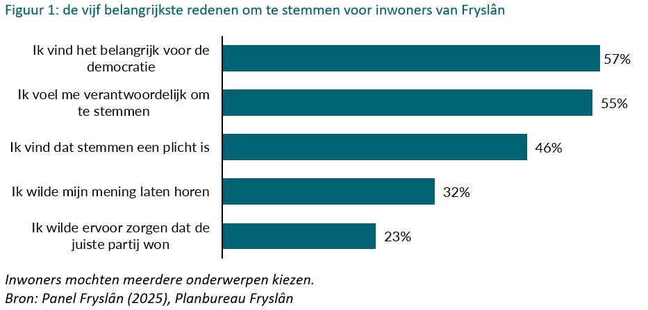 Inwoners van Fryslân gaan over het algemeen net iets vaker stemmen dan de rest van Nederland. De belangrijkste redenen voor hen om te stemmen zijn het belang van stemmen voor de democratie, een gevoel van verantwoordelijkheid en de opvatting dat stemmen een plicht is.