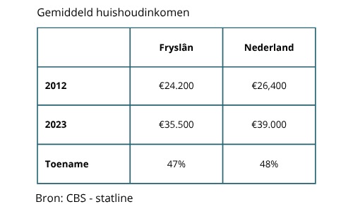 Het besteedbaar huishoudinkomen ligt in Fryslân lager ligt dan landelijk, zo blijkt uit onderstaande tabel. Ook is te zien dat dit verschil in de periode 2012-2023 een klein beetje groter is geworden. Want in die periode steeg het besteedbaar inkomen in Fryslân met 47 procent en landelijk met 48 procent.