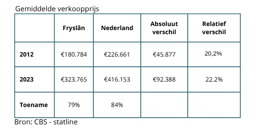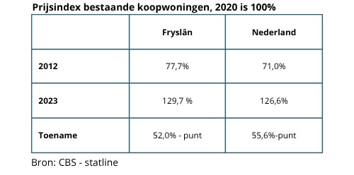 In de periode 2012 tot en met 2023 is de gemiddelde geïndexeerde woningprijs in Nederland toegenomen met 55,6 procentpunt, met het indexjaar 2020. In dezelfde periode zijn in Fryslân woningen gemiddeld met 52 procentpunt in (geïndexeerde) prijs toegenomen.
