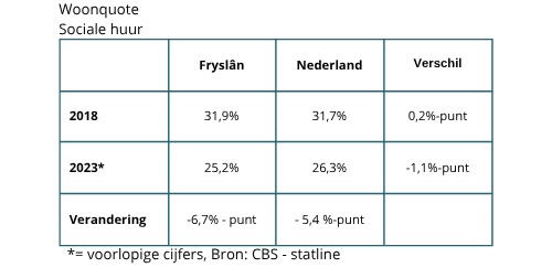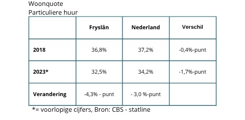 Het aandeel corporatiewoningen is in diezelfde periode, zowel in Fryslân als in Nederland, gedaald ten gunste van het aandeel particuliere huur. Deze verschuiving kan leiden tot een gemiddeld hogere woonquote omdat de woonquote van particuliere huurders doorgaans hoger is, zoals hiervoor werd toegelicht.