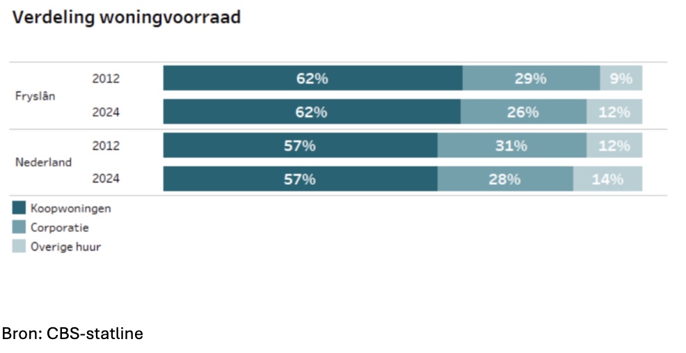Het aandeel koopwoningen ligt in Fryslân (62%) hoger dan in Nederland (57%). Dit is in de periode 2012 tot 2024 niet veranderd. De verhouding corporatie-woning en overige huur is wel veranderd.