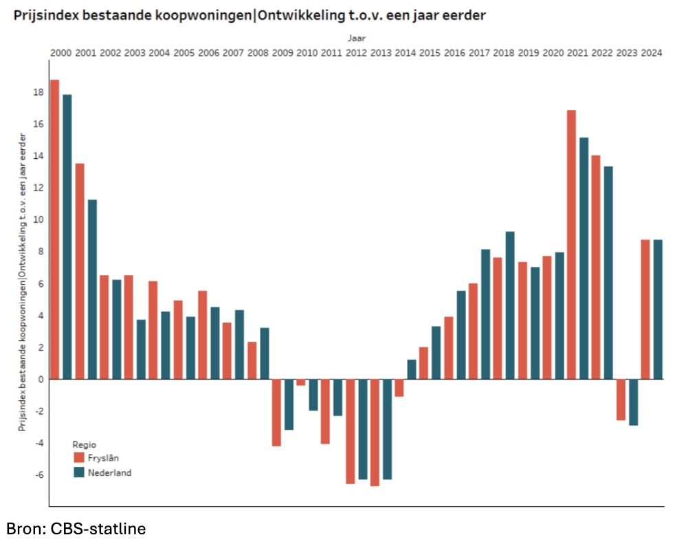 De ontwikkeling van woningprijzen verloopt in Fryslân anders dan in de rest van Nederland, en de mate van stijging of daling verschilt per periode.