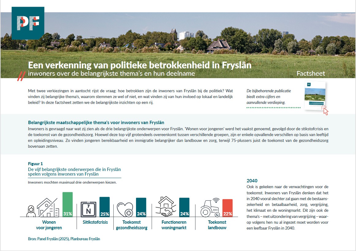 Met twee verkiezingen in aantocht doemt de vraag op hoe het ervoor staat met de politieke betrokkenheid van de inwoners van Fryslân. Wat zijn belangrijke thema’s voor Fryslân volgens de inwoners? Wat zijn hun redenen om naar de stembus te gaan? Hoe kijken ze naar de invloed die ze hebben op landelijk en lokaal beleid?